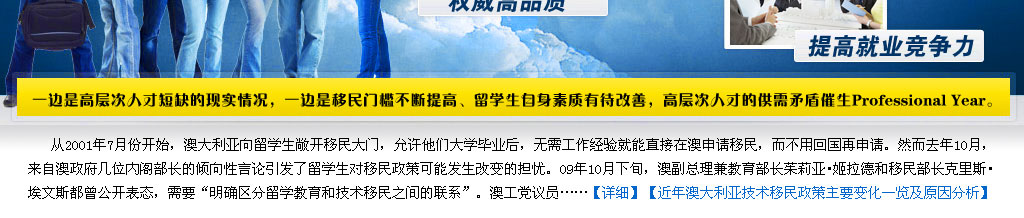 从2001年7月份开始,澳大利亚向留学生敞开移民大门,允许他们大学毕业后,无需工作经验就能直接在澳申请移民,而不用回国再申请。然而去年10月,来自澳政府几位内阁部长的倾向性言论引发了留学生对移民政策可能发生改变的担忧。09年10月下旬,澳副总理兼教育部长茱莉亚•姬拉德和移民部长克里斯•埃文斯都曾公开表态,需要“明确区分留学教育和技术移民之间的联系”。澳工党议员凯文•汤姆森甚至在国会上提出,留学生应该被强行遣返自己的原住国家去申请到澳大利亚的永居签证。此后从11月初全球教育管理集团下属五所提供职业课程的私校倒闭,到今年1月“工作就绪计划”(Job Ready Program)出台,这些事件令移民政策收紧趋势日益明朗。这其中有政党政治斗争的影响因素,但更多还是“市场需求”影响所致。